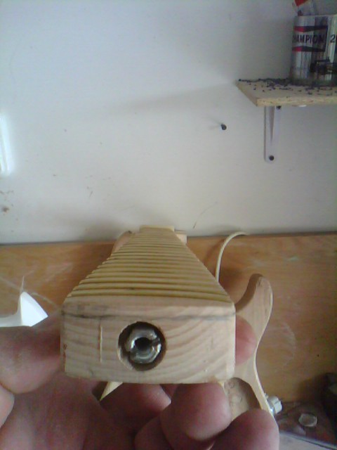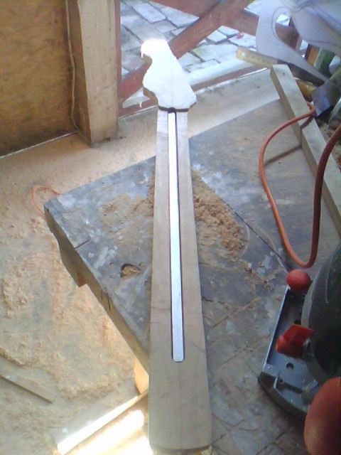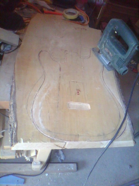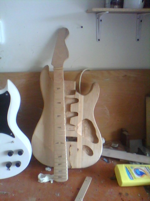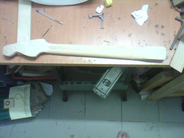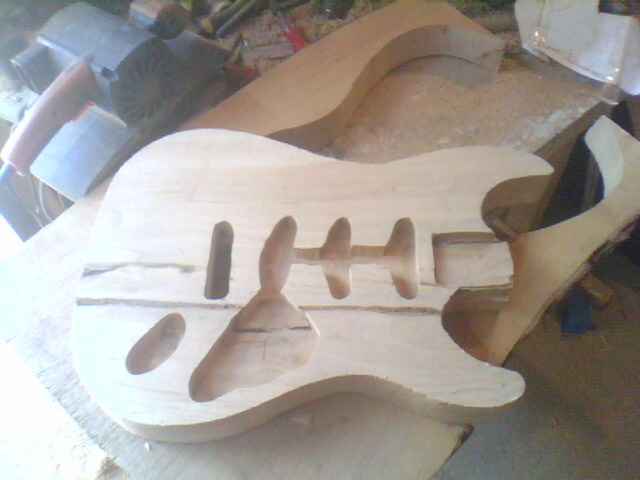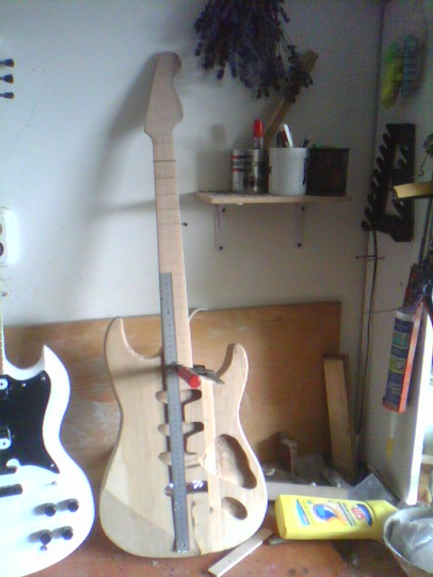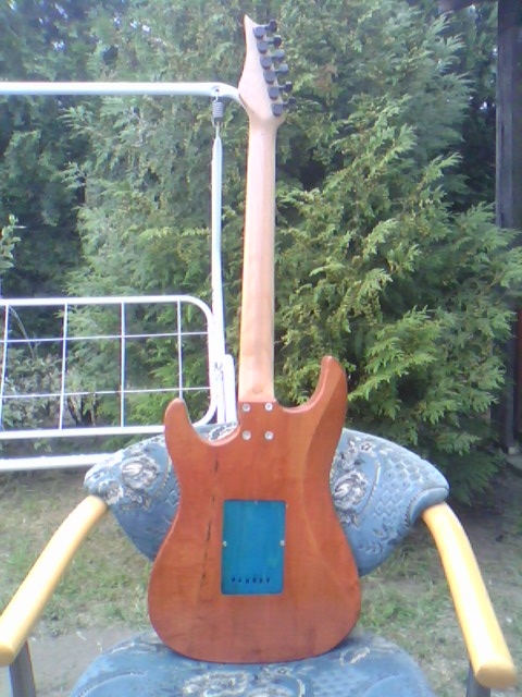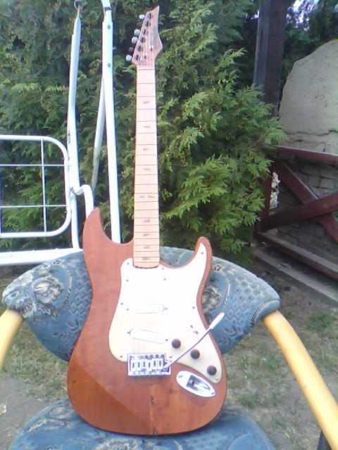 Egy majdnem Fender Stratocaster kópia születése Ismételten egy más számára értéktelennek tűnő, de nemek egy csodás élményt nyújtó deszkadarabot mentettem meg a tűthaláltól. Ebben az éger darabban lelki szemeim egy stratocaster jellegű testet véltek felfedezni. Azt hiszem jól látta a lelki szemem :) Szóljon hát a Stratjelleg: Mint mindíg most is rajzoltam és vágtam.Itt azonban már saját kivitelezéssel daraboltam. Marógéppel elkészítettem egy kis vezető nyomt, majd kézi fűrésszel nekiestem az anyagnak. Persze még mindíg nem voltam elég rutinos. Előbb végta, aztán martam. .. A test nagyolása után elkezdtem a nyak munkálatait. Kimartam egy darab bükk deszkából elkészítettem a nyakmerevítő pálcát, és a helyére tettem. Következő lépésben összeillesztettem a darabokat, hogy lássan milyen is az összkép Aztán elkszítettem a nyak bundozását és a jelölő pontokat, amik jelen esteben háromszögek lettek. És a végeredmény : Mint látható nagy ugrás történt a hangszer küllemében. Sajnos az egyes fázisok archiválása lustasgom és figyelmetlenségem miatt elmaradt, de a végeredmény magáért beszél szerintem. Nagyon szép a hangja. |
